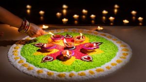 ৫. দীপাবলির গৃহ সজ্জায় অন্য মাত্রা আনে রঙ্গোলি, ফুল ও প্রদীপের ছোঁয়া। গাঁদার মালা দিয়েও নানা রকমের ডেকরেশন করে নিতে পারেন। রঙ্গোলির ওপর প্রদীপ দিয়ে দিন।