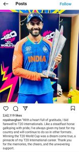 গর্বের সঙ্গে ছুটে চলা অটল ঘোড়ার মত, আমি সবসময় আমার দেশের জন্য আমার সেরাটা দিয়েছি এবং অন্যান্য ফরম্যাটেও তা করতে থাকব। টি-টোয়েন্টি বিশ্বকাপ জেতাটা ছিল স্বপ্ন পূরণ, আমার টি-টোয়েন্টি আন্তর্জাতিক ক্যারিয়ারের শীর্ষস্থান। স্মৃতি, চিয়ার্স এবং অটল সমর্থনের জন্য আপনাদের ধন্যবাদ।’