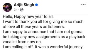 কলকাতা : বলিউডের সবচেয়ে জনপ্রিয় ও সফল গায়কদের মধ্যে একজন আরিজিত সিং বছরের প্রথম মাসেই এমন একটি ঘোষণা করেছেন, যা তাঁর ভক্তদের আবেগপ্রবণ করে তুলেছে। গায়ক সোশ্যাল মিডিয়ায় একটি পোস্ট শেয়ার করে জানিয়েছেন যে তিনি আর প্লেব্যাক সিঙ্গার হিসেবে নতুন কোনো অ্যাসাইনমেন্ট নেবেন না।