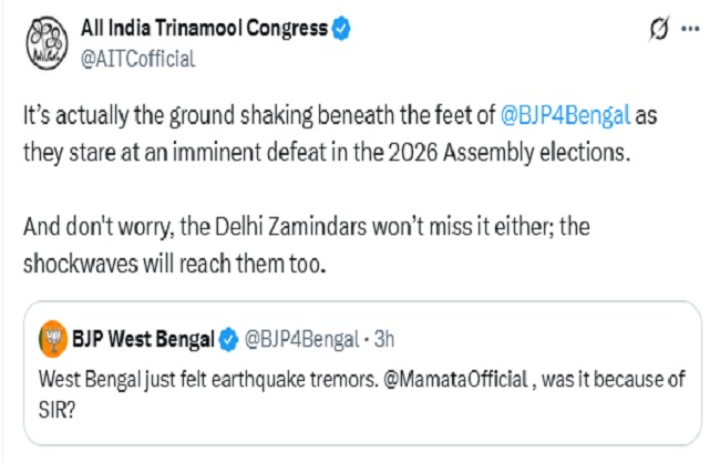 কলকাতা : শুক্রবার সকালে এ রাজ্যে ভূমিকম্পের রেশ কাটতে না কাটতেই তা নিয়ে রাজনীতির লড়াই শুরু হয়ে গেল বিজেপি ও তৃণমূলের মধ্যে। এ দিন সকালে ভূমিকম্পের কিছুক্ষণ পরেই রাজ্য বিজেপি–র এক্স হ্যান্ডলে মুখ্যমন্ত্রীকে ট্যাগ করে লেখা হয়, এই কম্পন কি এসআইআরের ভয়ে? যার উত্তরে কিছুক্ষণ পরেই তৃণমূলের তরফে এক্স হ্যান্ডলে জবাব দেওয়া হয় যে, ২০২৬ […]