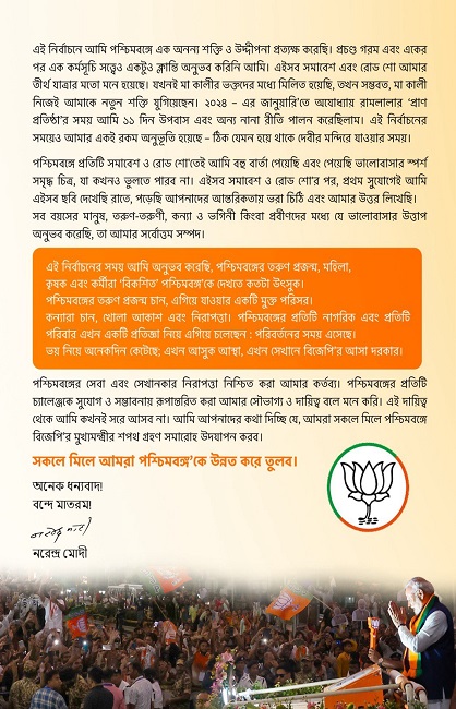 অডিও বার্তার পাশাপাশি আরেকটি পোস্টে তিনি লিখেছেন, “পশ্চিমবঙ্গের পুরো নির্বাচনী প্রচার চলাকালীন আমি আমার পরিবারবর্গের কাছ থেকে যে অগাধ স্নেহ ও আশীর্বাদ পেয়েছি, তা আমাকে এক নতুন শক্তিতে ভরিয়ে দিয়েছে। এখানকার যুবশক্তি হোক বা নারীশক্তি, আমাদের কৃষক ভাই-বোন হোক, শ্রমিক বা ব্যবসায়ী, সকলেই ‘বিকশিত বাংলা’ গড়ার জন্য সংকল্পবদ্ধ। এই চিঠিতে আমি তাঁদের প্রতি আমার মনোভাব ব্যক্ত করেছি…”