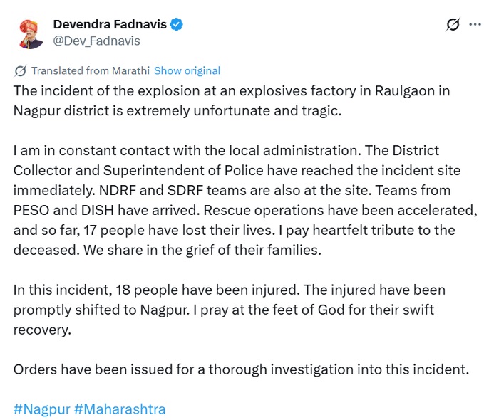 মহারাষ্ট্রের মুখ্যমন্ত্রী দেবেন্দ্র ফড়নবিস এক্স মাধ্যমে জানিয়েছেন, “এনডিআরএফ এবং এসডিআরএফ দলও ঘটনাস্থলে রয়েছে। ১৭ জন প্রাণ হারিয়েছেন। আমি নিহতদের প্রতি আন্তরিক শ্রদ্ধা জানাই। এই ঘটনায় ১৮ জন আহত হয়েছেন। আহতদের দ্রুত নাগপুরে স্থানান্তরিত করা হয়েছে। এই ঘটনার পূর্ণাঙ্গ তদন্তের নির্দেশ দেওয়া হয়েছে।”