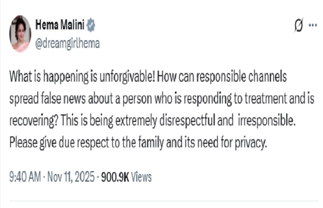 মুম্বই : প্রবীণ অভিনেত্রী হেমা মালিনী তাঁর স্বামী ধর্মেন্দ্রর স্বাস্থ্য নিয়ে ছড়ানো একাধিক ভুয়ো খবরের বিষয়ে অবশেষে মুখ খুলেছেন। ৮৯ বছর বয়সী এই তারকার মৃত্যুর গুজবকে অস্বীকার করে, হেমা এক্স-এ এই ভুল তথ্য ছড়ানোর বিরুদ্ধে নিজের ক্ষোভ এবং হতাশা প্রকাশ করেছেন। হেমা মালিনী লিখেছেন, যা হচ্ছে তা ক্ষমার অযোগ্য! দায়িত্বশীল চ্যানেলগুলো কীভাবে এমন একজন ব্যক্তির সম্পর্কে মিথ্যা খবর ছড়াতে পারে যিনি চিকিৎসায় সাড়া দিচ্ছেন এবং সুস্থ হয়ে উঠছেন? এটি অত্যন্ত অসম্মানজনক এবং দায়িত্বজ্ঞানহীন কাজ। দয়া করে পরিবারকে এবং তাদের গোপনীয়তার প্রয়োজনকে যথাযথ সম্মান দিন।’