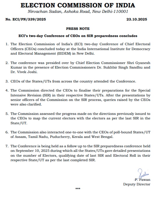 এদিন নির্বাচন কমিশন জানিয়েছে, নির্বাচন কমিশন নিজ নিজ রাজ্য ও কেন্দ্রশাসিত অঞ্চলে বিশেষ নিবিড় সংশোধন-এর প্রস্তুতি চূড়ান্ত করার জন্য সিইওদের নির্দেশ দিয়েছে। এসআইআর প্রক্রিয়া সম্পর্কে কমিশনের ঊর্ধ্বতন আধিকারিকদের উপস্থাপনার পর, সিইও-দের উত্থাপিত প্রশ্নেরও ব্যাখ্যা দেওয়া হয়েছে।