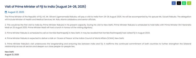 নয়াদিল্লি : সস্ত্রীক ভারত সফরে আসছেন ফিজির প্রধানমন্ত্রী সিতেনি লিগামামাদা রাবুকা। আগামী ২৪ থেকে ২৬ আগস্ট ভারত সফরে আসছেন তিনি।