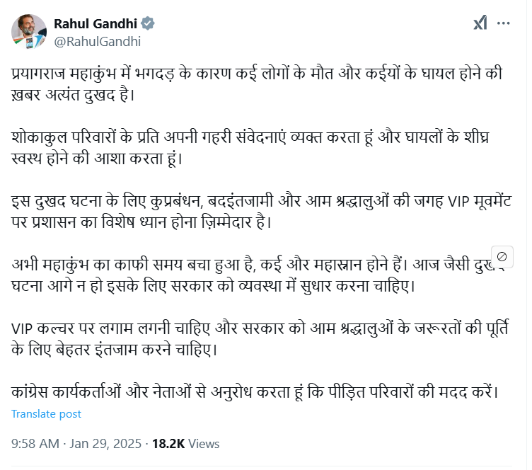 বুধবার সামাজিক মাধ্যম এক্স-এ রাহুল লিখেছেন, প্রয়াগরাজের মহাকুম্ভে পদপিষ্ট হয়ে বহু মানুষের প্রাণহানির খবর ও অনেকে আহত হওয়ার খবর অত্যন্ত দুঃখজনক। আমি শোকাহত পরিবারের প্রতি গভীর সমবেদনা জানাই এবং আহতদের দ্রুত আরোগ্য কামনা করছি।
