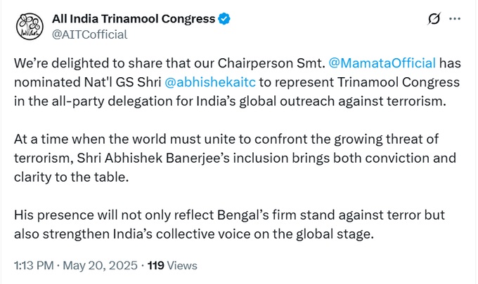 মঙ্গলবার তৃণমূল কংগ্রেসের পক্ষ থেকে জানানো হয়েছে, “আমরা আনন্দের সঙ্গে জানাচ্ছি, আমাদের চেয়ারপার্সন মমতা বন্দ্যোপাধ্যায় সর্বদলীয় প্রতিনিধিদলের জন্য তৃণমূল কংগ্রেসের প্রতিনিধিত্ব করতে অভিষেক বন্দ্যোপাধ্যায়কে মনোনীত করেছেন।”