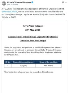 কলকাতা : কালীগঞ্জ বিধানসভা আসনের উপনির্বাচনে প্রার্থী ঘোষণা করলো তৃণমূল কংগ্রেস। কালীগঞ্জ কেন্দ্রে তৃণমূল প্রার্থী করেছে আলিফা আহমেদকে। প্রয়াত তৃণমূল বিধায়ক নাসিরউদ্দিন আহমেদের মেয়ে হলেন আলিফা। ১৯ জুন নদিয়ার কালীগঞ্জ বিধানসভা কেন্দ্রে উপনির্বাচন। ২৩ জুন উপনির্বাচনের ফল ঘোষণা। তৃণমূল বিধায়ক নাসিরউদ্দিন আহমেদের মৃত্যুর জেরে উপনির্বাচন হচ্ছে। বাবার জেতা আসনে মেয়েকে প্রার্থী করল শাসক দল।