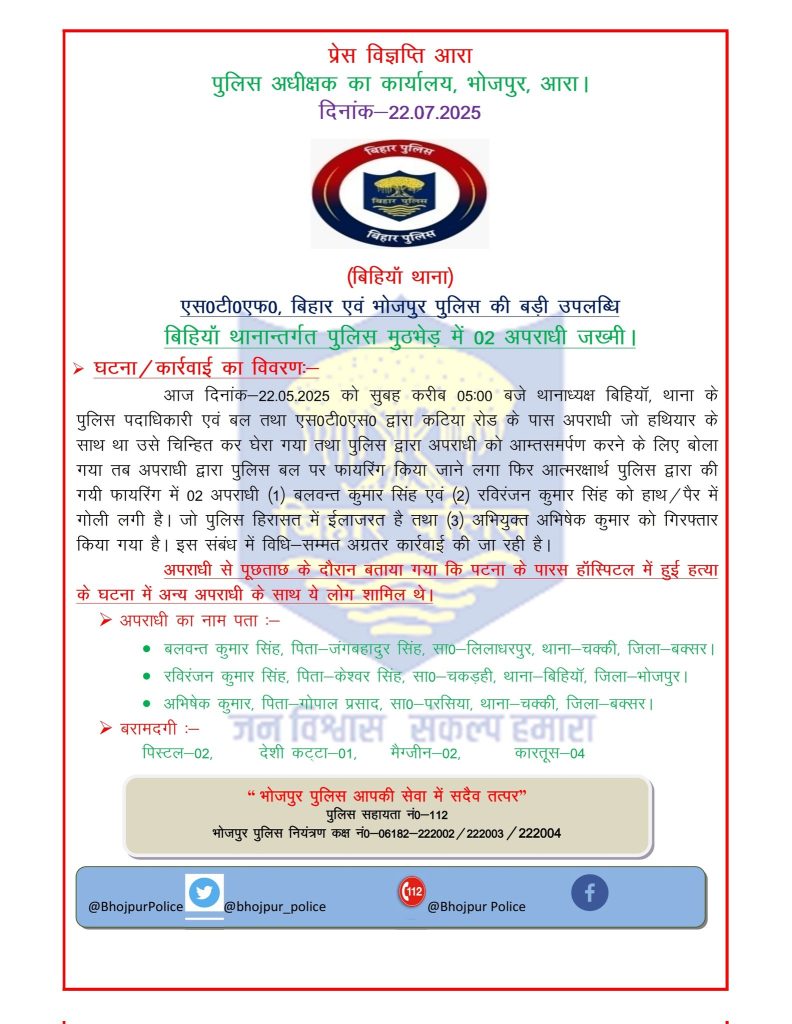 অভিষেক কুমার নামে তৃতীয় অপরাধীকে গ্রেফতার করা হয়েছে। তারা অন্যান্য অপরাধীদের সঙ্গে ১৭ জুলাই পারস হাসপাতালে সংঘটিত হত্যাকাণ্ডের সঙ্গে জড়িত ছিল। তাদের কাছ থেকে অস্ত্র ও গুলি উদ্ধার করা হয়েছে। পুলিশ জানিয়েছে, মঙ্গলবার সকালে বিহিয়া রেল স্টেশনের কাছে চন্দন মিশ্র হত্যা মামলার সঙ্গে জড়িত অপরাধীদের সঙ্গে এসটিএফ, ভোজপুর পুলিশ এবং অপরাধীদের মধ্যে এনকাউন্টার হয়। গোপন তথ্যের ভিত্তিতে পুলিশ অভিযুক্তদের গ্রেফতারের জন্য অভিযান চালায়, যখন তাদের উপর প্রচণ্ড গুলিবর্ষণ করা হয়। পুলিশ পাল্টা গুলি চালালে দুই অপরাধী গুলিবিদ্ধ হয় এবং একজনকে গ্রেফতার করা হয়।