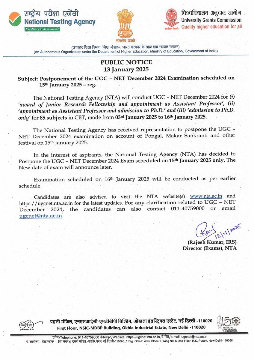 ন্যাশনাল টেস্টিং এজেন্সি মঙ্গলবার বিজ্ঞপ্তি জারি করে জানিয়েছে, ১৫ জানুয়ারি, বুধবার যে পরীক্ষা হওয়ার কথা ছিল, তা পিছিয়ে দেওয়া হচ্ছে। তবে, ১৬ জানুয়ারির পরীক্ষা হবে। ১৫ তারিখের পরীক্ষা কবে হবে, তাও শীঘ্রই জানিয়ে দেওয়া হবে বলে জানিয়েছে এনটিএ।