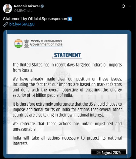 ভারত এই অতিরিক্ত শুল্কের ঘোষণাকে “দুর্ভাগ্যজনক” বলে মন্তব্য করেছে এবং বলেছে, সাম্প্রতিক সময়ে আমেরিকা ইচ্ছাকৃতভাবে রাশিয়া থেকে ভারতের তেল আমদানিকে লক্ষ্যবস্তু করেছে। এসব বিষয়ে ভারত ইতিমধ্যেই নিজের অবস্থান পরিষ্কার করেছে, যেখানে বলা হয়েছে, ভারতের আমদানি বাজারের পরিস্থিতির উপর নির্ভরশীল এবং এর উদ্দেশ্য হলো ১৪০ কোটিরও বেশি জনসংখ্যার দেশের জ্বালানি নিরাপত্তা নিশ্চিত করা। আমেরিকার এই পদক্ষেপকে “অন্যায্য, অযৌক্তিক ও অপ্রয়োজনীয়” বলে আখ্যায়িত করে ভারত জানিয়েছে, জাতীয় স্বার্থ রক্ষায় প্রয়োজনীয় সব পদক্ষেপ নেওয়া হবে।