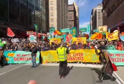 প্রেসিডেন্ট ট্রাম্প ও তাঁর প্রশাসনের নীতির বিরুদ্ধে দেশব্যাপী ‘নো কিংস’ র্যালির অংশ হিসেবে নিউ ইয়র্কবাসীরা টাইমস স্কয়ারের চারপাশের রাস্তায় ভিড় জমায় এবং প্ল্যাকার্ড হাতে স্লোগান দেন।